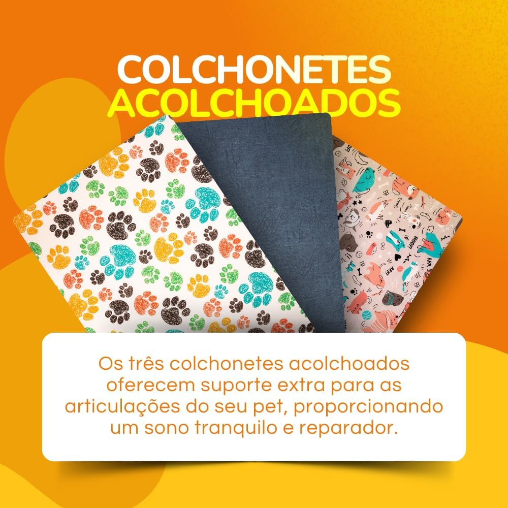 Três Colchonetes Inclusos: Acompanha três colchonetes macios e removíveis que proporcionam uma experiência aconchegante e oferecem apoio ideal para o descanso do seu pet.