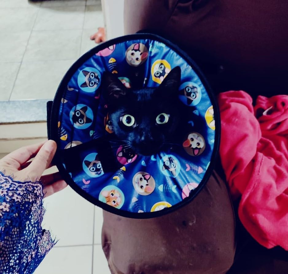 Colar pós-cirúrgico para GATOS ATENÇÃO: É super importante tirar as medidas corretamente para a escolha do tamanho ideal. Se houver dúvida ao escolher o tamanho do produto, opte sempre por um número maior para ter a certeza que o colar servirá no pescoço de seu pet, pois se o animal for muito agitado, ele pode conseguir abrir o colar, caso esse não esteja totalmente ajustado. Para qualquer dúvida, estamos lhe aguardando no campo de perguntas. EVITE DEVOLUÇÕES O Colar Elizabetano King of Pets é indicado para proteger seu pet na recuperação de cirurgias e tratamentos diversos de saúde. Como o nosso produto é fabricado em tecido revestido de emborrachado, não deixa que seu pet fique mais estressado ainda quando estiver doentinho, pois se dobra facilmente na hora dele se alimentar ou tirar uma soneca e não faz barulho quando ele se encostar nas paredes ou móveis, o que permite ainda os indesejáveis arranhões causados pelo colar de plástico. Como tem o fechamento em carrapicho nosso colar permite que regule melhor no pescoço do animal. Esse modelo é EXCLUSIVO para gatos, por serem mais curtos, não precisam ser retirados ou dobrados para a alimentação do animal. Nossa tabela de tamanhos está anexa as fotos. Temos em 04 tamanhos. COMO MEDIR E USAR O COLAR: Há duas medidas necessárias na hora de comprar o colar: – Altura do colar: medida da coleira até a ponta do focinho – o colar deve ultrapassar o focinho do animal para que ele não consiga se lamber – Contorno do pescoço: é a medida circunferência do pescoço (como se fosse o tamanho da coleira) Ao tirar a medida do pescoço, se atente ao fato de o colar ser regulado com carrapicho de até 15 cm, dependendo do tamanho. O ideal é utilizar junto uma coleira para dar fixação e evitar que o animal tire o objeto durante o uso. Passe a coleira nas alças e logo em seguida coloque no seu pet, ajuste o carrapicho da maneira mais confortável para ele. OBS: As referências de medidas de circunferência do pescoço e comprimento da coleira ao focinho (na lateral) são aproximadas, devido à variação acentuada do porte físico dos animais.