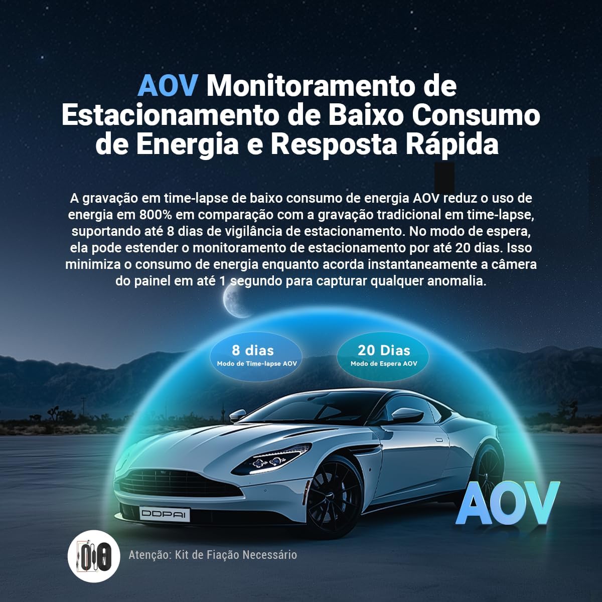 ** Kits Hardwire de outras marcas não são compatíveis com as câmeras DDPAI. Utilize o kit Hardwire exclusivo da DDPAI (ASIN: B0DJ2JVXLK ou B0DJ2JQ2Z4) para ativar o monitoramento de estacionamento 24 horas. Sem o kit Hardwire, a câmera gravará e monitorará apenas enquanto o veículo estiver ligado.