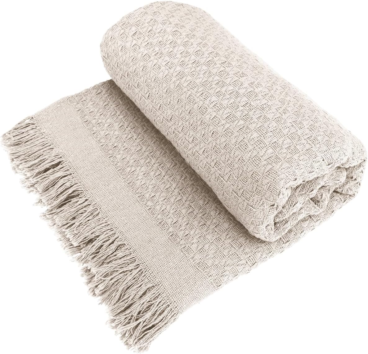 Decolab Manta para Sofá em Algodão com Franjas Artesanais | Cobertor Decorativo para Sofa, Poltrona e Cama | Estilo Boho Chic (Branca-Cru)