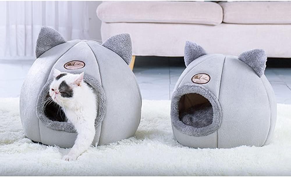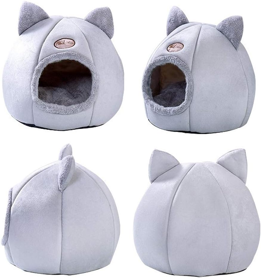 Dê ao seu gatinho uma cama própria. Esta confortável cama de dormir para animais de estimação apresenta uma forma de tenda fechada e uma almofada removível, fundo antiderrapante e design dobrável. Proporcionando um local aconchegante para os animais de estimação se divertirem e brincar.